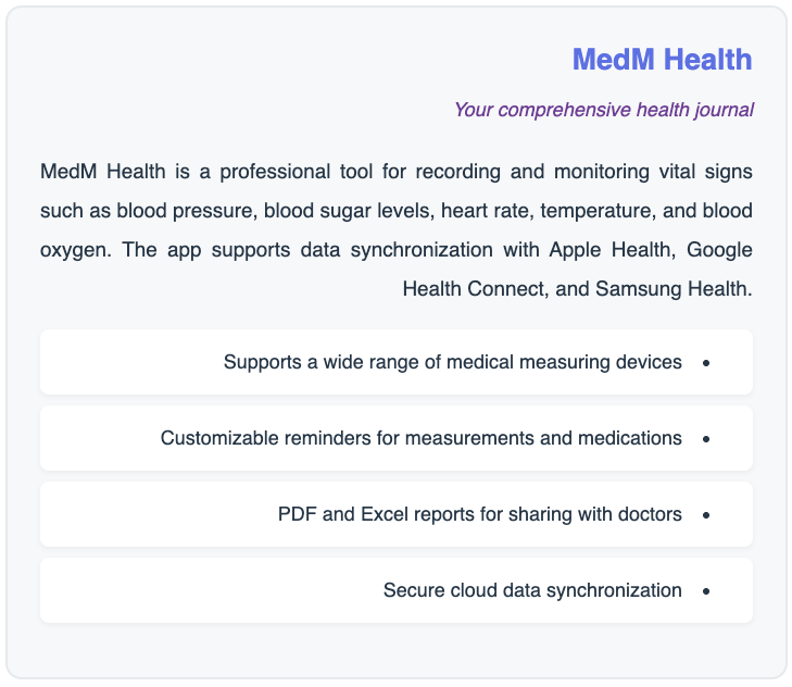 The article by Dr. AbdulQawi Almohamadi goes on to overview nutrition and healthy eating applications, fitness and activity apps, mental and psychological health applications, sleep and recovery applications. MedM platform is reviewed in the "specialized applications in vital signs" section: "MedM Health is a professional tool for recording and monitoring vital signs such as blood pressure, blood sugar levels, heart rate, temperature, and blood oxygen. The app supports data synchronization with Apple Health, Google Health Connect, and Samsung Health".